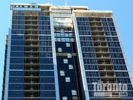 Meanwhile, down at street level, the hoarding that protected the sidewalk along the front of the construction site is gradually being removed. However, work remains to be done on the canopy above the condo’s main entrance, as well as on landscaping in front of the tower.