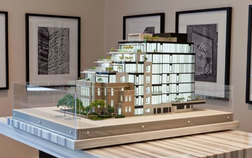 This photo, from the 36Hazelton website, shows the north and east sides of a building model that had been displayed in the project presentation center.