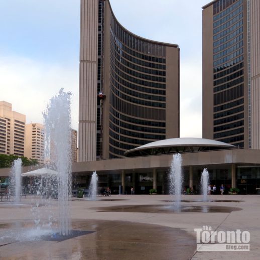September 7 2012: New water fountains adds some moisture and motion to the north half of Nathan Phillips Square in front of City Hall’s clamshell towers …