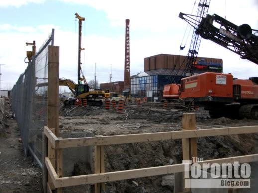 The construction entrance on Bremner Boulevard. The beige building to the immediate north of the work site is the Metro Toronto Convention Centre …