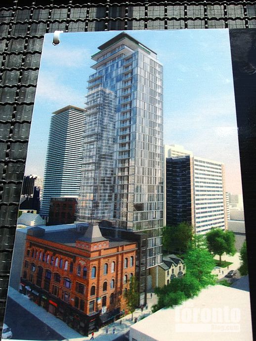This artistic rendering depicts the 38-storey condo tower that Toronto developer Diamondcorp has planned for 159 Wellesley Street East, at the southwest corner of Sherbourne and Wellesley Streets. The image appears on a development proposal sign posted on the property.