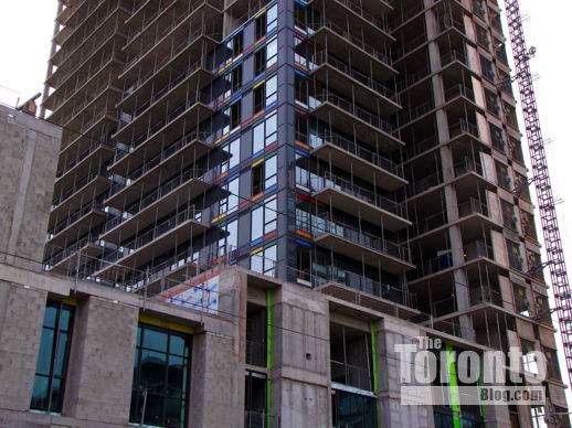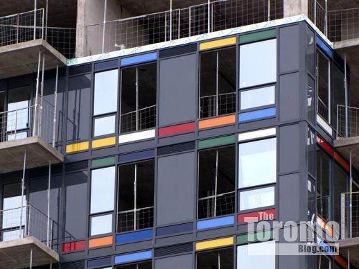Designed by Quadrangle Architects Limited of Toronto, the 116-meter highrise would feature gentle curves, a masonry-clad podium, and distinctive coloured glass panels on its corner windows. The tower would be set back 3 meters from Sherbourne Street, 4 metres from Wellesley Street, 5 meters from the laneway to its west, and 3.5 metres from the 3-storey retail and apartment building to its south.