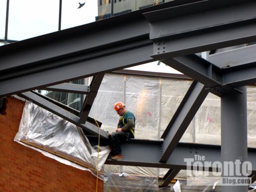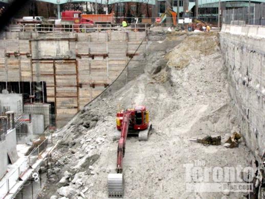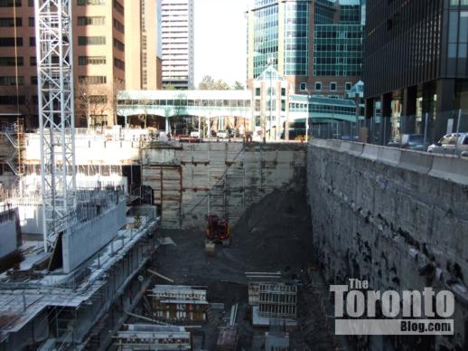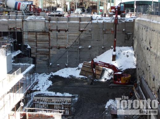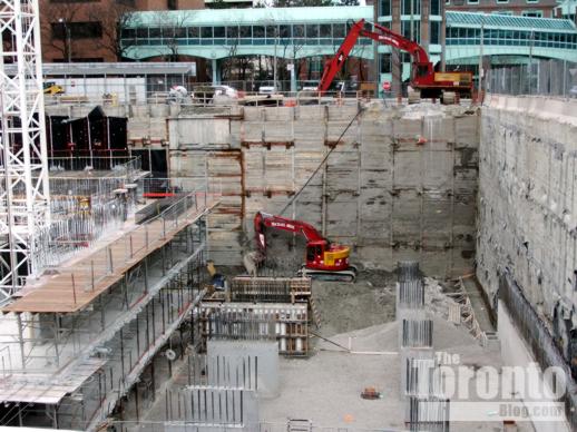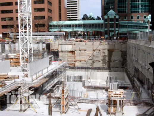 For the next several years, though, I’ll have to wait and watch while FIVE goes up. That should be equally interesting to follow. While crews dig a 19-meter-deep excavation on the construction site, the five-story facade of the Rawlinson building on St Joseph Street will have to be preserved and maintained. That means a steel support structure must be erected on the street to hold the wall in place. Although the five-storey west wall of the historical building on St Nicholas Street will be dismantled to allow for construction of the FIVE tower, it will be rebuilt. Since the developer needs construction staging areas, on-street parking spaces must be removed from the south side of St Joseph; meanwhile, the narrow (5.5-meter wide) stretch of St Nicholas between St Joseph and Phipps Street must be closed altogether for the duration of construction. The street closures and parking space removals could cost the developer $216,000 in fees payable to the city, full details of which are outlined in a March 30 2011 city report.