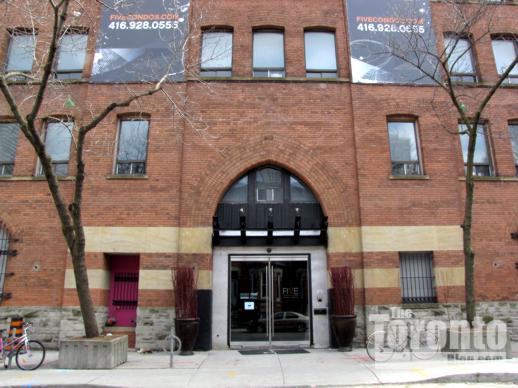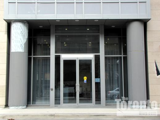 April 22 2011: The entrance to the FIVE Condos presentation and sales centre at 5 St Joseph Street. The street level premises of this former Rawlinson Cartage building have been home to at least three gay bars: Katrina’s during the 1980s, Colby’s in the 1990s, and 5ive in the early 2000s.
