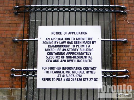 The development proposal sign that was posted outside 5 St Joseph Street, seen here in December 2008. The original plan proposed a 49-storey tower, but a 45-floor tower will be built instead.