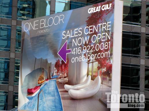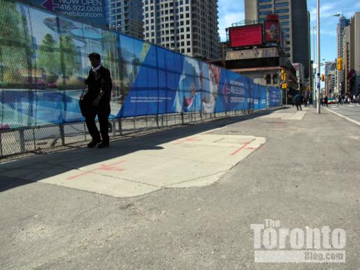 April 19 2010: A view of the southwest corner of Yonge and St Joseph Streets. A long advertising banner indicates the Yonge Street properties that are part of the FIVE Condos development site