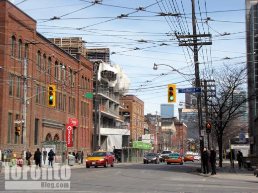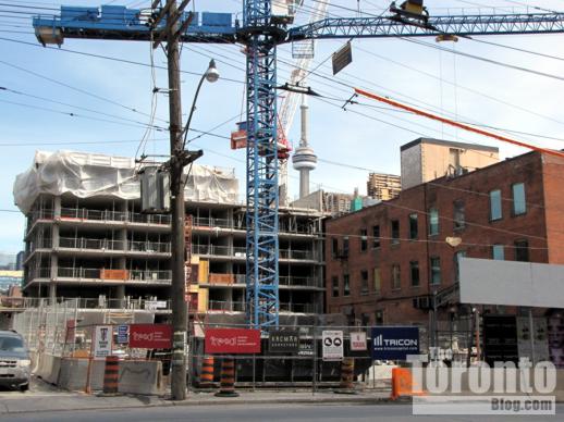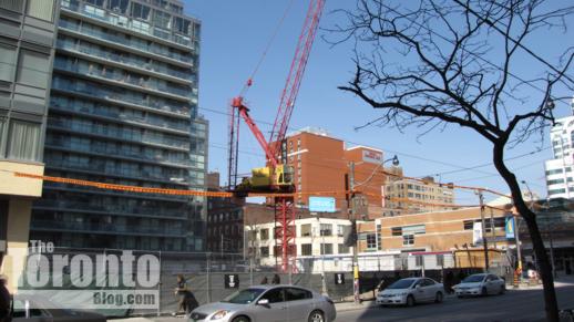 March 11 2010: King Street West view toward Charlotte Street. The King Charlotte condo site is the white building with the turquoise sign on its roof (in the middle of the photo). The construction crane is building Charlie Condos at the corner of Charlotte and King; the Glas condominium midrise stands to its immediate north.