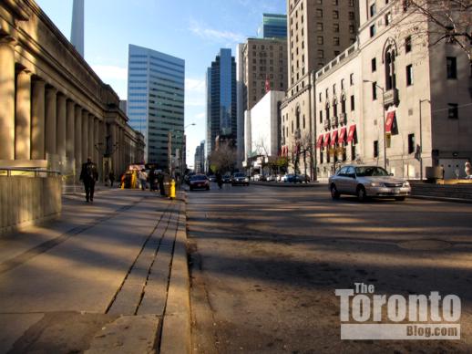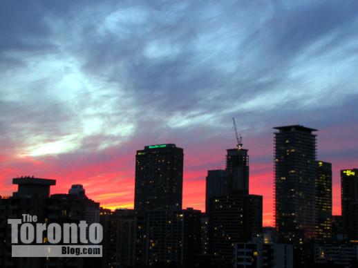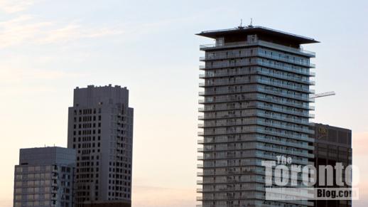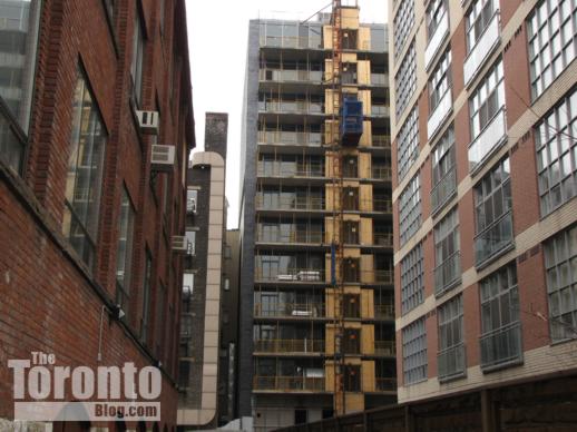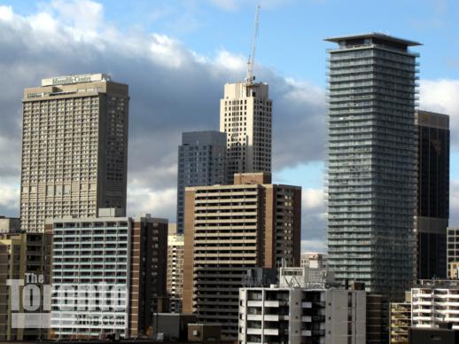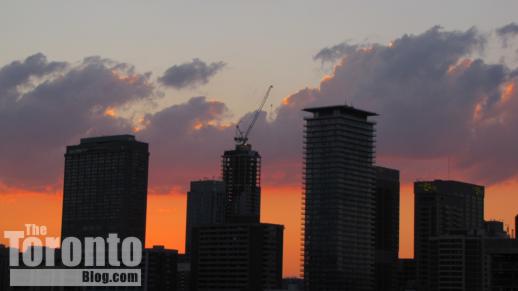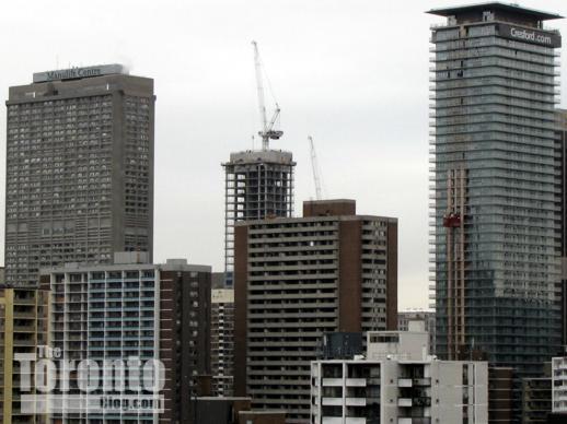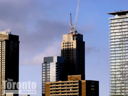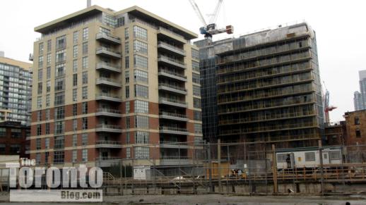Southwest view towards downtown Toronto’s Financial District towers from the construction zone along Sumach Street