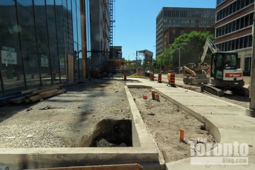 July 19 2011: Construction of the relocated Peace Garden continues along the western flank of Nathan Phillips Square next to Osgoode Hall (right) …