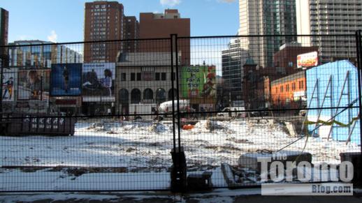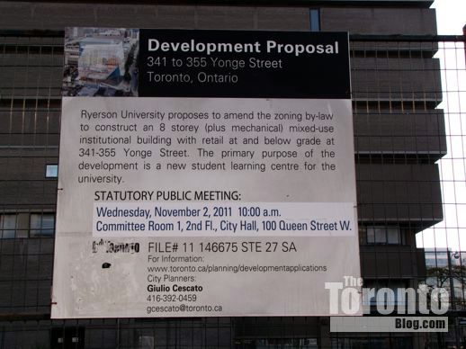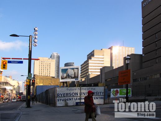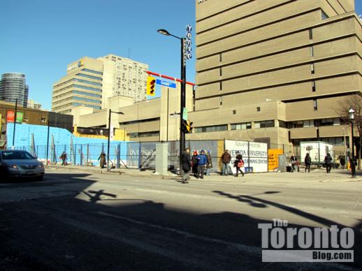 November 1 2011: Looking north across the Ryerson University Student Learning Centre site from the southwest corner of Yonge and Gould Streets