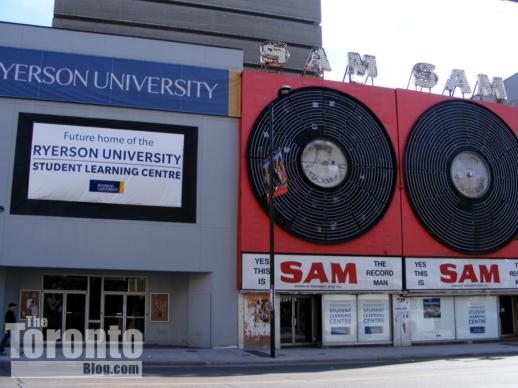 Below are photos of the Student Learning Centre site this morning as well as a rendering, from the Ryerson University website, suggesting how the centre’s retail facade on Yonge Street will look. Renderings of the building interior can be viewed in my April 8 2011 post about the project, while earlier photos of the building site — including the iconic Sam the Record Man store that previously occupied the property — can be viewed in my February 15 2011 post.