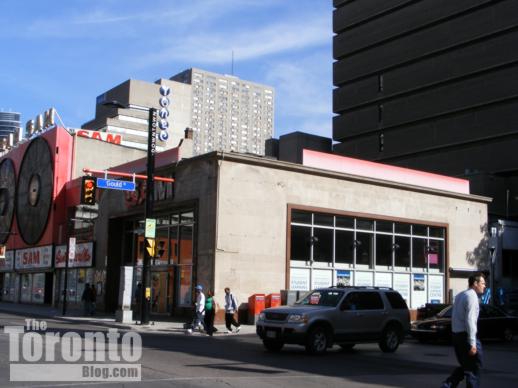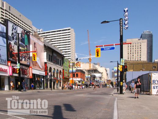 September 3 2011: Looking north from Gould Street at the strip of retail shops along the west side of Yonge Street, opposite the Student Learning Centre site