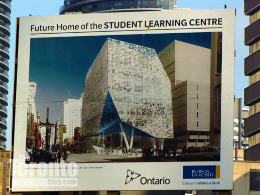 An illustration of the new Ryerson University Student Learning Centre appears on this sign at the building site at the NE corner of Yonge and Gould Streets