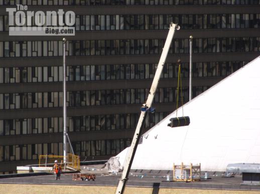 Work crew atop the Maple Leaf Gardens domed roof December 21 2010