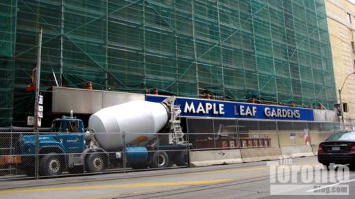 November 17 2011: Construction activity on the north and east sides of Maple Leaf Gardens. On weekdays, the building is constantly surrounded by cranes, equipment supply vehicles, and concrete delivery trucks and pumpers.