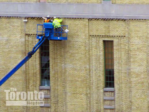 November 3 2011: Two men on a portable lift work on the Church Street facade