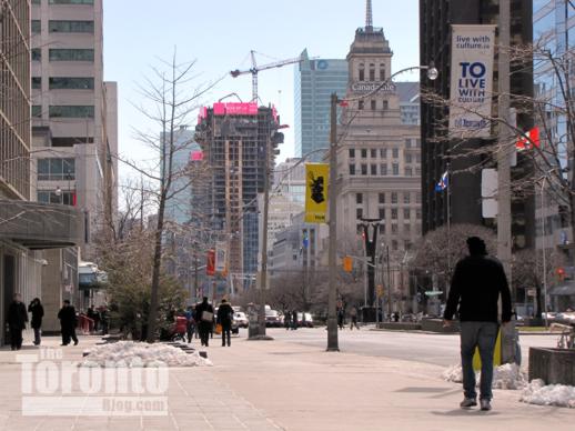 …and a southeast view of the Centre as it appeared on February 18. The 26-storey PricewaterhouseCooper head office building at 18 York Street (right) is nearing completion, but excavation is still in early stages for the Delta Toronto hotel and Bremner office tower office still to be built.