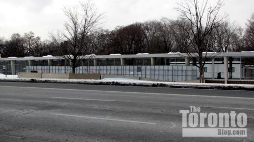 The construction entrance on Bremner Boulevard. The beige building to the immediate north of the work site is the Metro Toronto Convention Centre …