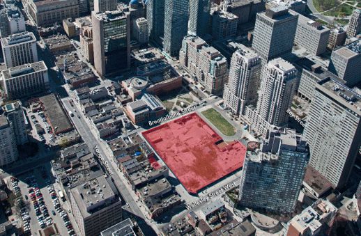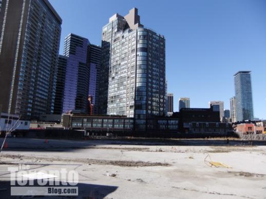 May 4 2011: Demolition progress viewed from the groundbreaking ceremony location, looking west toward the enormous Rogers Communications building