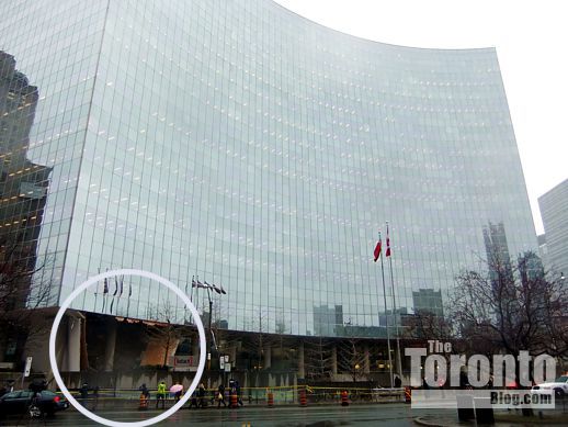 The demolition work will disappoint any city heritage buffs who may have been hoping that the building might be retained as part of any new development project. The City of Toronto had intended to designate 90 Harbour as a heritage building several years ago because of its “cultural heritage value” as “a representative example of a mid-20th Century office building that blends features of the three prevalent styles of the period.” As a “reasons for listing” document explained: “While the symmetry, cladding and profile reflect Modern Classical styling, the stepped plan and vertical elements recall Art Deco and the band windows are identified with the Art Moderne. All three styles were introduced in the 1920s and remained popular until the International Style or Modern Movement gained acceptance in the 1960s.” However, the City could not proceed with the heritage designation because it did not have authority, under Ontario law, to impose such a designation on provincial government property. The City subsequently withdrew its notice of intention to designate, and issued a demolition permit on February 14 2011.