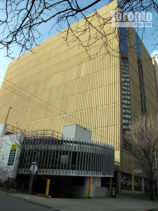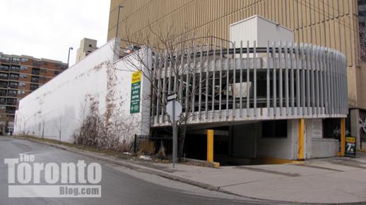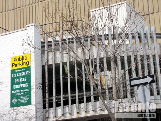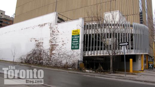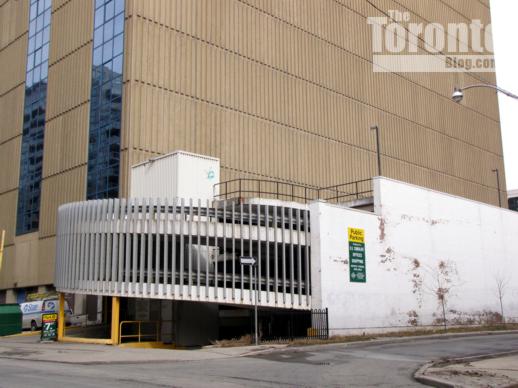 February 18 2011: The view from St Patrick Street, looking east along Michael Sweet Avenue. At left is the future 210 Simcoe condo site — at this time still a low-rise parking garage that extends all the way to Simcoe Street. Beside it is a Bell Canada building at 220 Simcoe. On the right is a 5-level above-ground parking garage that also extends all the way to Simcoe Street. Toronto City Hall, located just a few blocks to the east east, is visible in the background.
