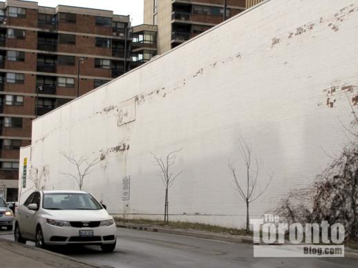 Two windowless walls used to dominate the north side of the street. One, its dirty white paint peeling off, was part of a narrow, low-rise parking facility built next to the sidewalk. Rising 54 meters behind it — roughly the height of a 14-storey residential highrise — was the solid textured wall of a Bell Canada utility building. Thanks to the unattractive blank walls and the pair of parking garages, Michael Sweet Avenue has never been a pleasant pedestrian environment, but only a convenient way to move between Simcoe and St Patrick Streets. Functional, but ugly.