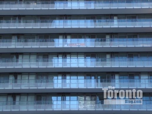 Final touches? Major construction concluded a few months ago, residents have been moving into the building ever since, and now it appears that Lumiere Condominiums on Bay Street is finally getting finishing touches to its exterior. Or is it? In my first post about Lumiere on January 5, I noted that aluminum panels were missing from large, long sections of the building podium. About two weeks later, as I reported in a January 21 update post, I saw crews working on some of the unfinished areas. But they didn’t do much, and the podium’s exterior remained incomplete throughout the winter. However, aluminum panel installation has resumed, so it’s possible the podium cladding project could literally wrap up this spring. Crews are concentrating on the west side of Lumiere, along Laplante Avenue, but still have some small areas to attend to on the south side as well. Below are some pics I snapped Sunday afternoon of the podium work underway at Lumiere.