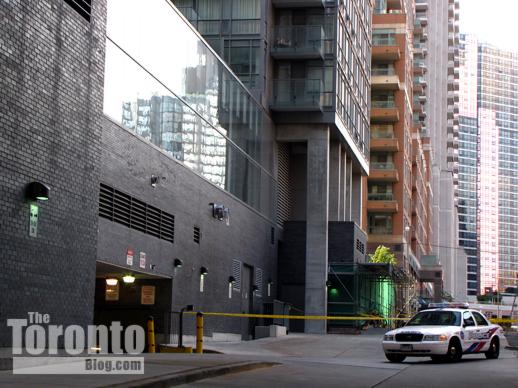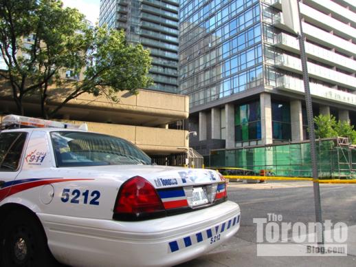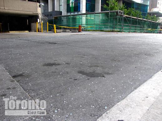 August 15 2011: Police closed the east traffic lane and sidewalk on Bay Street, as well as the intersection of Bay and Grenville Streets, after broken glass from a Murano condo balcony panel plunged to the ground and hit a passerby