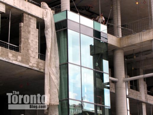 August 8 2011: Crews install the first 3-storey section of glass cladding