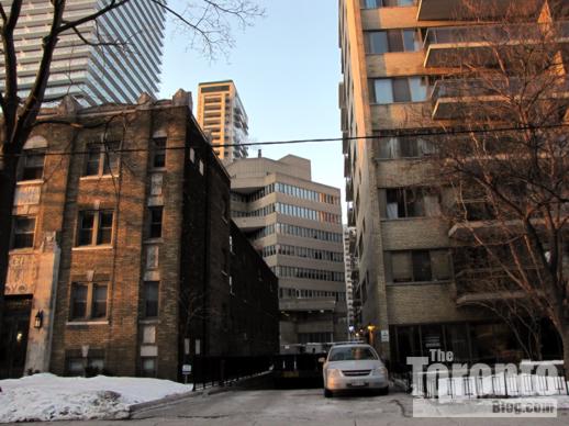 A view of FIVE from the south on St Luke Lane, next to the Toronto Central YMCA Centre (left). This view will change drastically in several years when Lanterra Developments builds its 60-storey 11 Wellesley on the Park condo tower on the property partly visible on the left side of St Luke Lane (presently occupied by a row of trees and a condo presentation centre behind them).