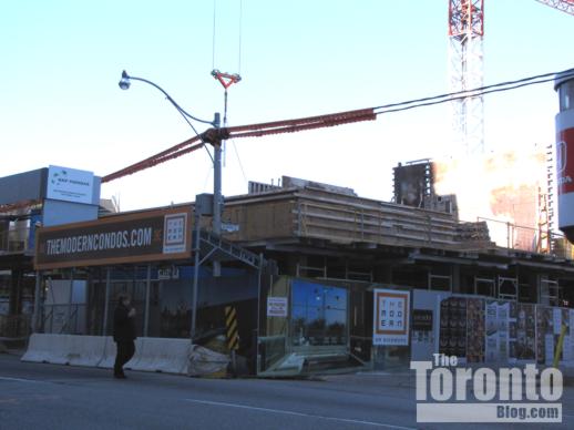 The 192 Jarvis condo rises above the fenced-off plaza on Dundas Street