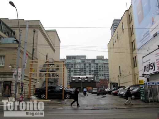 Looking toward the 48-storey FIVE Condos tower from two blocks to the southeast, at the corner of Yonge and Maitland Streets. To its right is the Nicholas Residences condo tower, two blocks north.