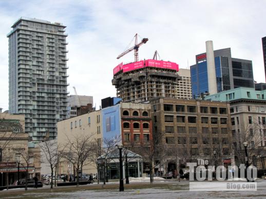 Construction crews are closing in the mechanical penthouse levels of the 49-storey X2 Condominiums at the southwest corner of Jarvis & Charles Streets