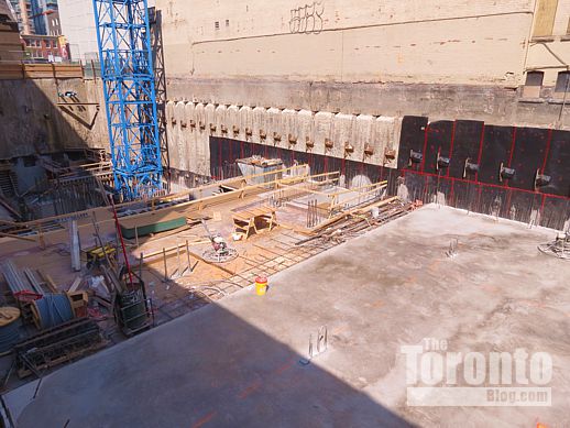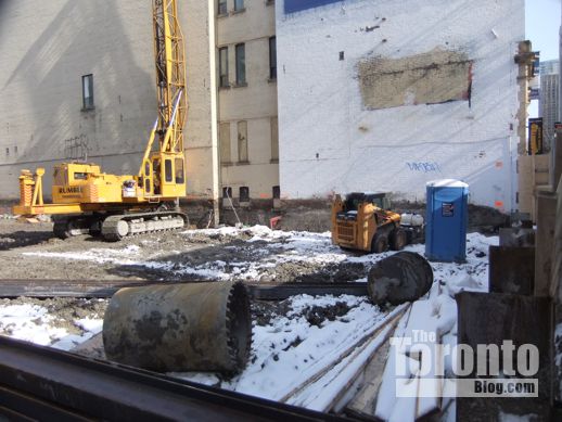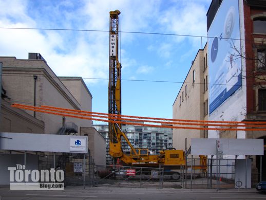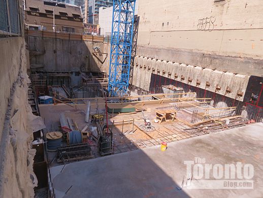 Although construction has climbed only one-third of the way to its ultimate 75 storeys, the One Bloor condo tower is already making a huge architectural statement at the Yonge & Bloor crossroads in Yorkville. I shot this photo from the southwest corner of Yonge & Charles Streets.