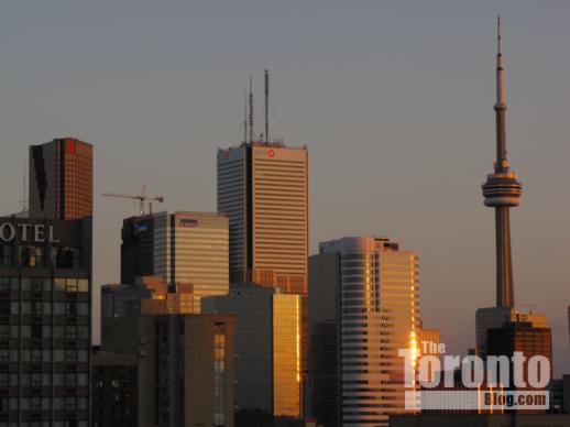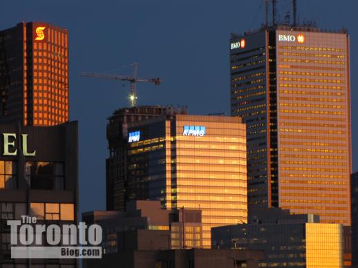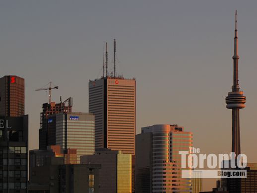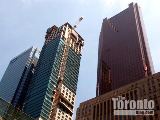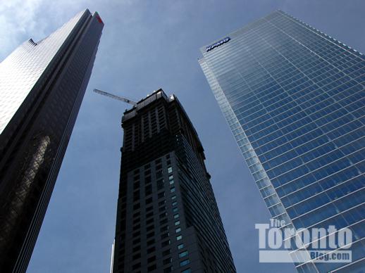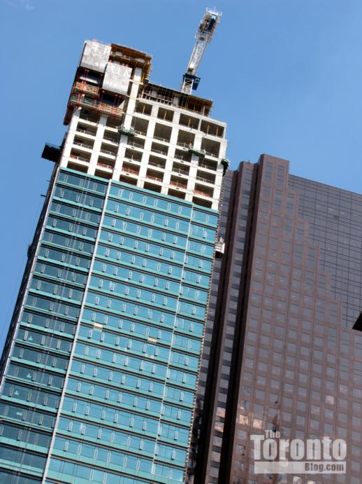 For years, my balcony view of the Financial District skyline never changed. I had a terrific view of the CN Tower, First Canadian Place and Scotia Plaza, and could even see the TD Bank Tower at the Toronto-Dominion Centre. Things changed considerably in mid 2009. That summer, the Bay Adelaide Centre (BAC) topped off at 50 floors and obscured nearly all of my view of the TD Bank building, while the 43-storey RBC Centre blocked a bit of the CN Tower (only the lower third, thankfully). In 2010, part of the RBC Centre’s next-door neighbour, the new Ritz-Carlton Hotel, came into view (appearing behind other towers this time, not blocking sight of them). Within just a couple more months, I’ll get to see another new skyscraper when the Trump International Hotel and Tower overtakes the Bay Adelaide Centre in height.