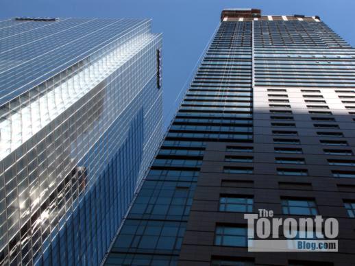 August 1 2011: The Trump Toronto Tower viewed from Adelaide Street West near the Living Shangri-La Toronto (left), another new skyscraper I will profile in an upcoming installment of “Checking in on the 5-star hotel/condo towers”