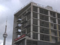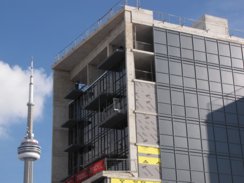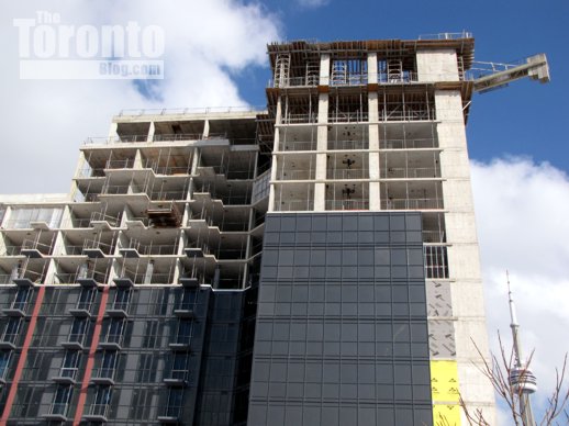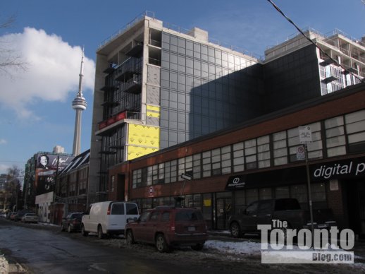 Looking up the north side of the Studio on Richmond condo tower situated between Simcoe and Duncan Streets in the Entertainment District. It will top off at 31 storeys. Its 41-storey sister tower, Studio2, is currently under construction behind it on Nelson Street.