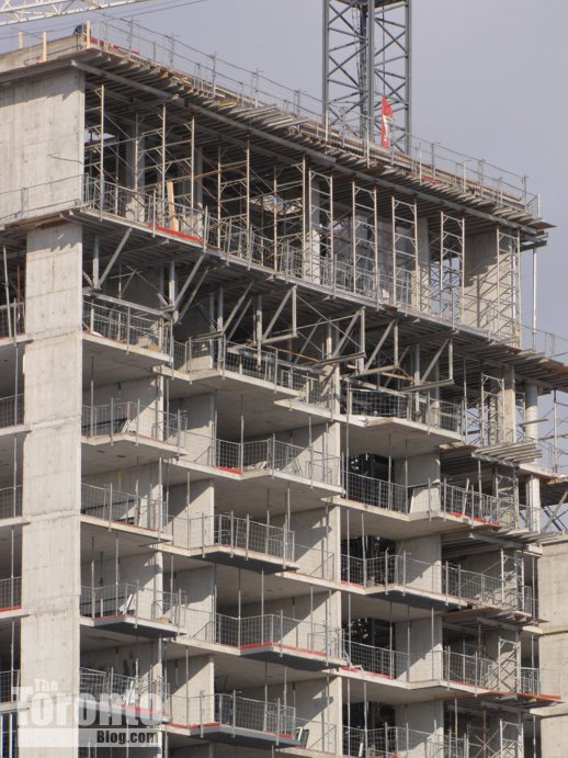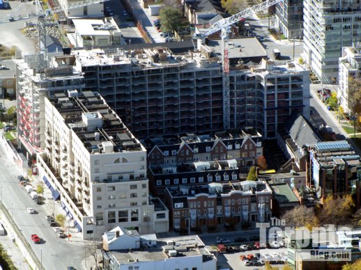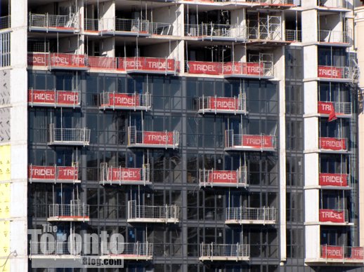 Construction crews are closing in the mechanical penthouse levels of the 49-storey X2 Condominiums at the southwest corner of Jarvis & Charles Streets