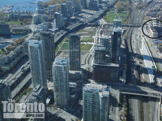 A view of the two towers from Grand Trunk Crescent to their northwest