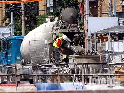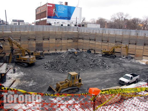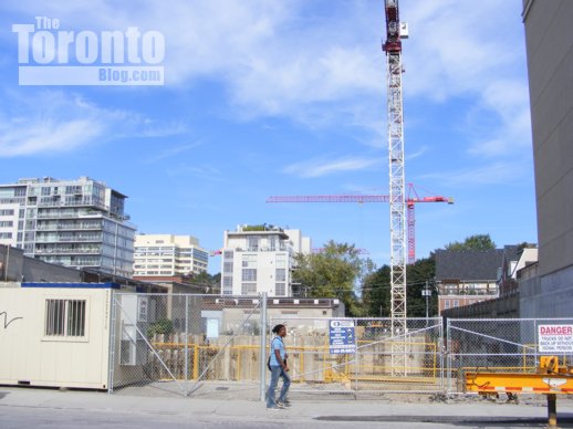 Although construction has climbed only one-third of the way to its ultimate 75 storeys, the One Bloor condo tower is already making a huge architectural statement at the Yonge & Bloor crossroads in Yorkville. I shot this photo from the southwest corner of Yonge & Charles Streets.