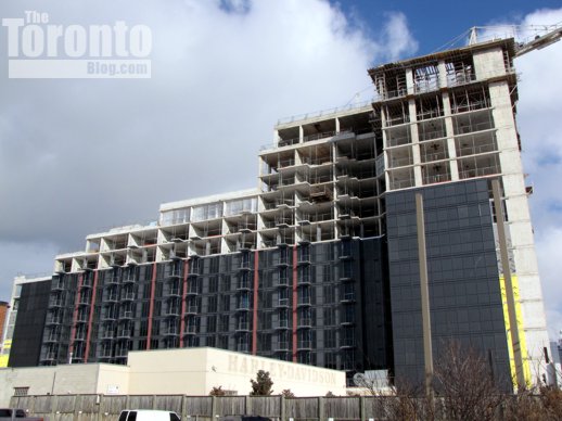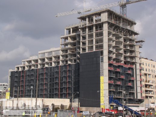 The west U Condos building has topped off at 45 storeys, while the east tower continues its climb toward 55 floors. U Condos is a project of Pemberton Group, and was designed by architectsAlliance of Toronto.
