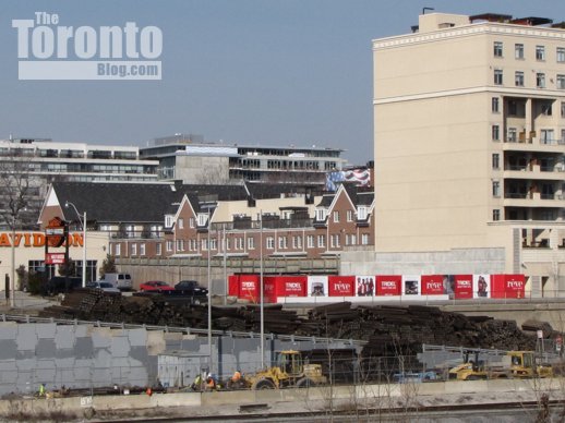 The Delta Toronto hotel (left) and the Bremner office tower are nearing completion at Southcore Financial Centre on Bremner Boulevard between York Street and Simcoe Street. The buildings are seen here from Roundhouse Park, near the Toronto Railway Museum.