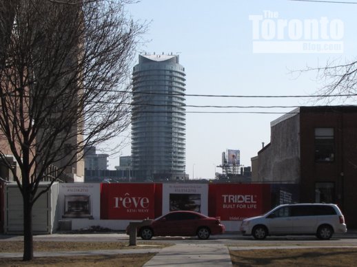 X2 Condos viewed from one block to the southwest on Isabella Street. The tower is a project of Lifetime Developments and Great Gulf Homes.