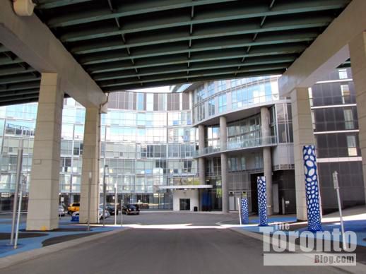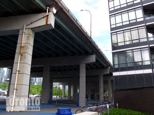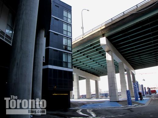 Visitors drive or walk beneath the Gardiner to reach the condo entrance