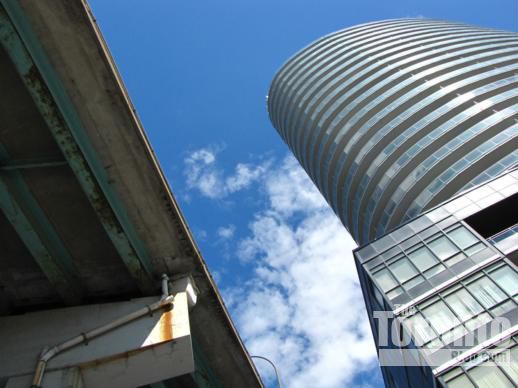 Looking up at the elevated Gardiner Expressway and the 24-storey Panorama condo tower from the west side of the condo property