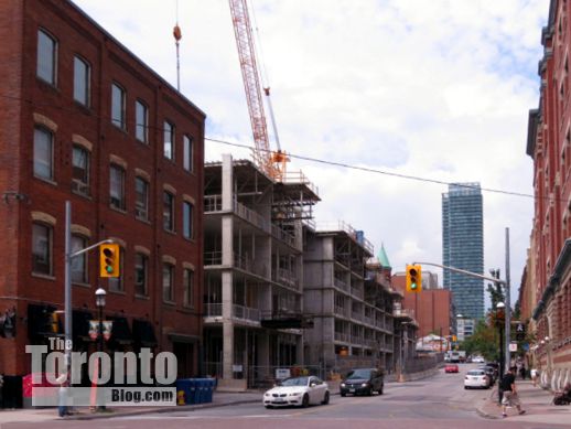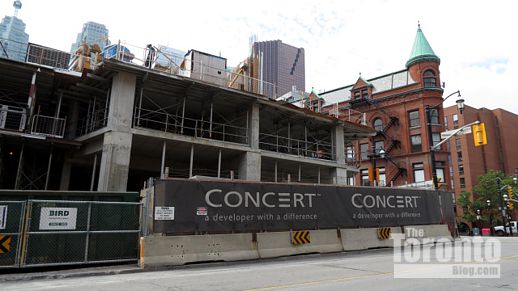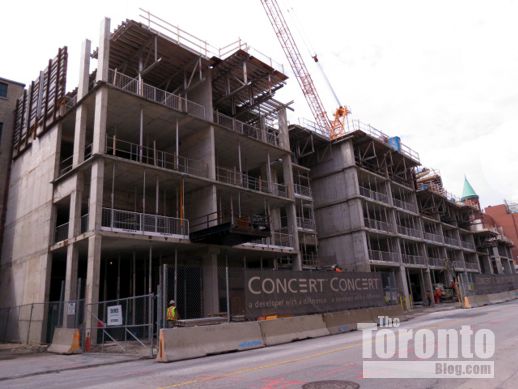 Looking up the north side of the Studio on Richmond condo tower situated between Simcoe and Duncan Streets in the Entertainment District. It will top off at 31 storeys. Its 41-storey sister tower, Studio2, is currently under construction behind it on Nelson Street.