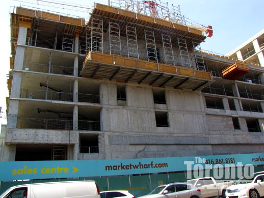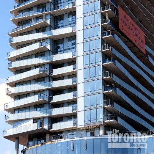 Making waves: Construction of the 25-storey Market Wharf tower is attracting more attention these days as the condo building’s distinctively curved amenities floor and wavy “curvilinear” balconies continue to take shape while the newly-opened Shoppers Drug Mart draws traffic to the northeast street-level corner of the complex’s 8-storey podium. Occupying an entire city block near the bottom of Jarvis Street, between the railway tracks and Toronto’s historic St. Lawrence Market, Market Wharf will keep making waves as the tower climbs more prominently into view on the skyline.