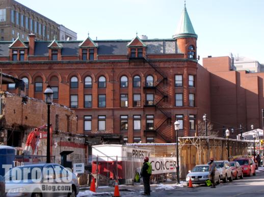 Lower Church Street view of The Berczy condo site on March 7 2011: Demolition progress means much of the Flatiron building is now visible across the site…