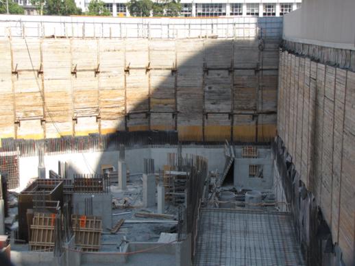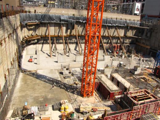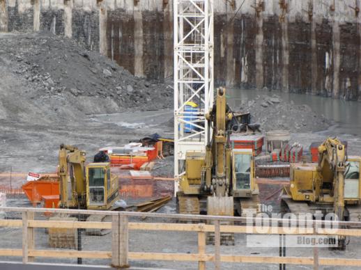 Break time? Idle earth movers at the top of the excavation
