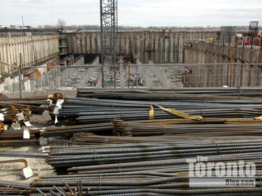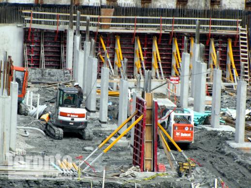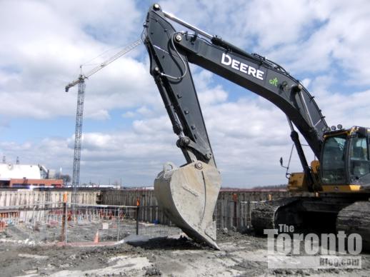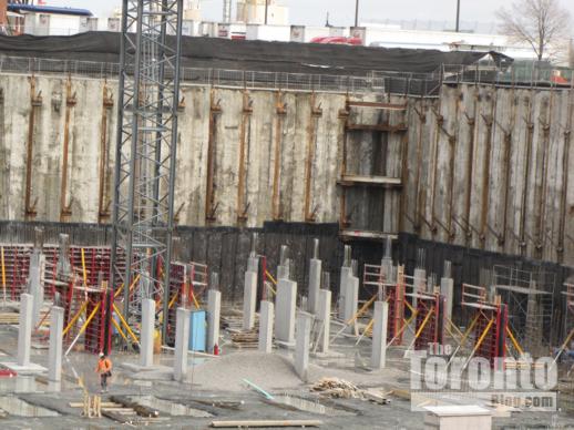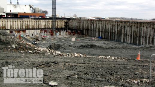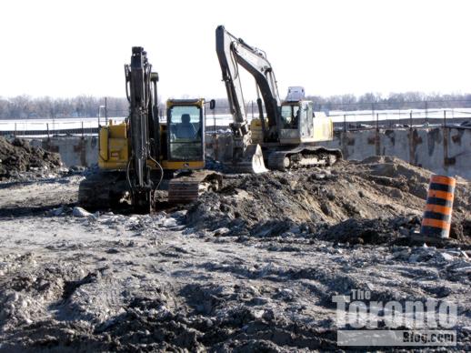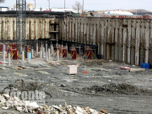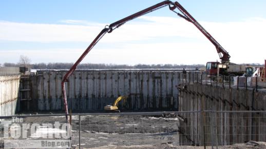 Crane coming?: Thanks to the spring-like thaw in the weather over the past couple of days, the excavation at the Pier 27 condo development on the waterfront has become one enormous muddy hole in the ground. But construction work continues nonetheless, and today I saw a concrete pumper truck at the northeastern end of the massive waterfront excavation. Since it looks to me — from the street and sales centre parking lot, at least — that the lion’s share of digging has been done, I suspect that concrete was being poured to build the base on which a construction crane will be installed sometime very soon.